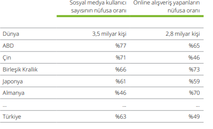 - Bu tabloda nüfusun yaklaşık %77’sinin sosyal medya hesabı olan ABD ilk sırada gelirken onu sırasıyla %71’ile Çin, %66 ile Birleşik Krallık ve ilk beşte yer almasa da %63 ile Türkiye takip etmektedir. (Türkiye’de 52 milyon sosyal medya kullanıcısın tekabül etmektedir.)